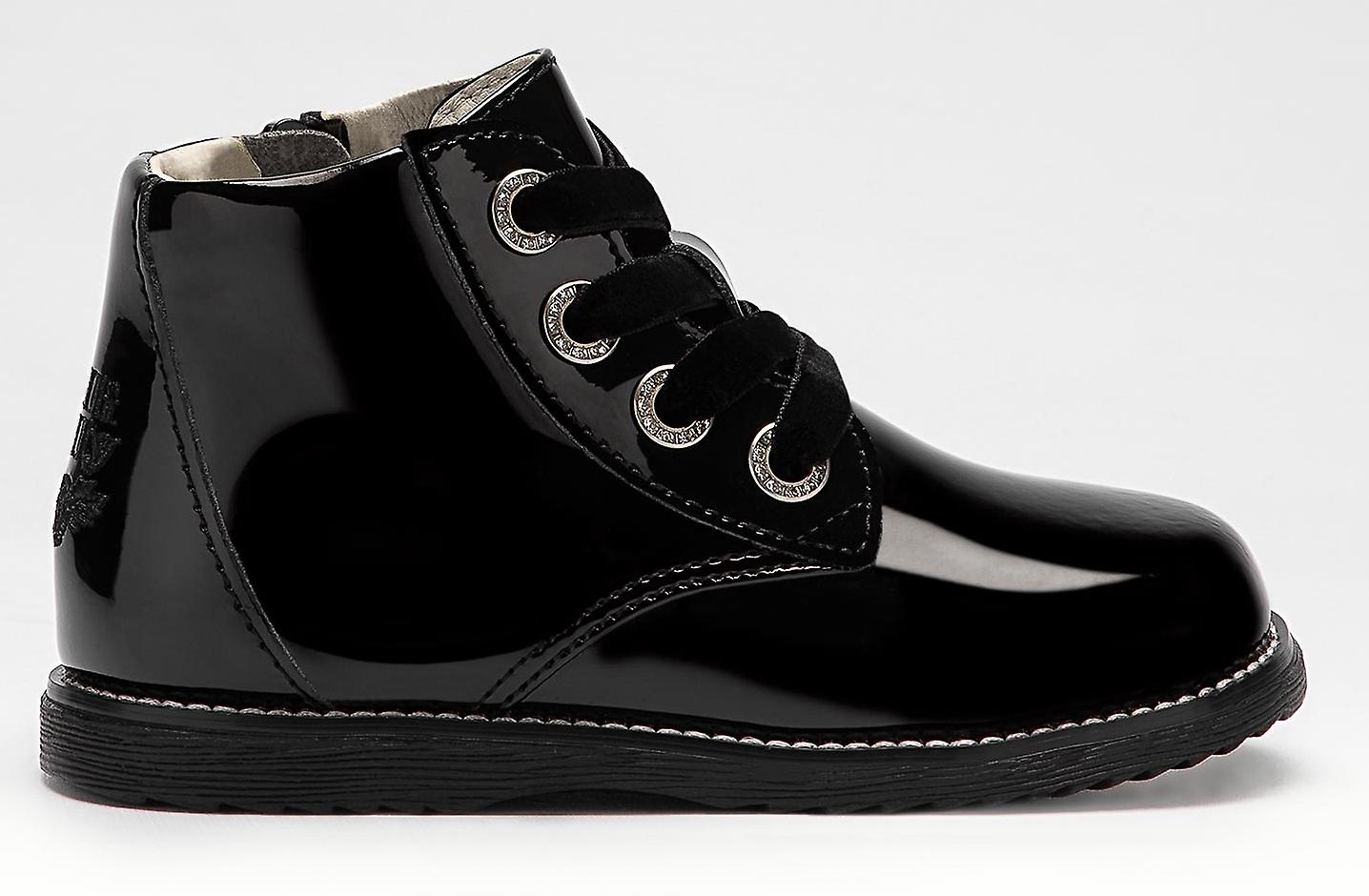 New In for the little ones- Lelli Kelly Camille Black Patent leather boots, leather & textile lining with metal eyelets with a choice of ribbon or woven laces, zip fastening on the side making them easy to slip on and off. Lelli Kelly branding embroidered on the heel, non-slip sturdy sole. Standard fit.