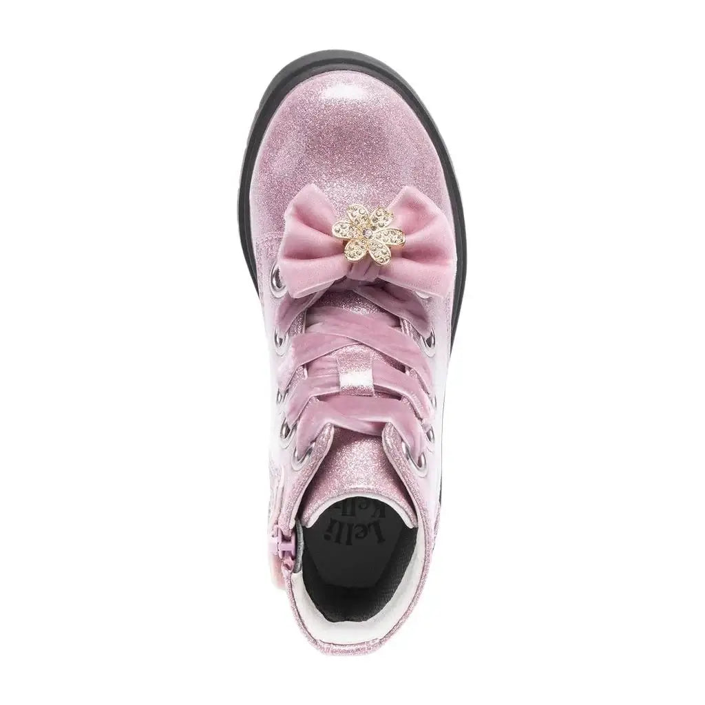 New Season Lelli Kelly Girls Winter Pink Glitter Boots Winter is far from dull wearing the Fior Di Fiocco pink glitter shimmer boots. Pink sparkly uppers with a choice of velvet laces or cotton pink laces. Side zip fastening for easy on/off. A large bow sits on the front with a gold and diamante flower in the centre. Black sole unit completes the look.