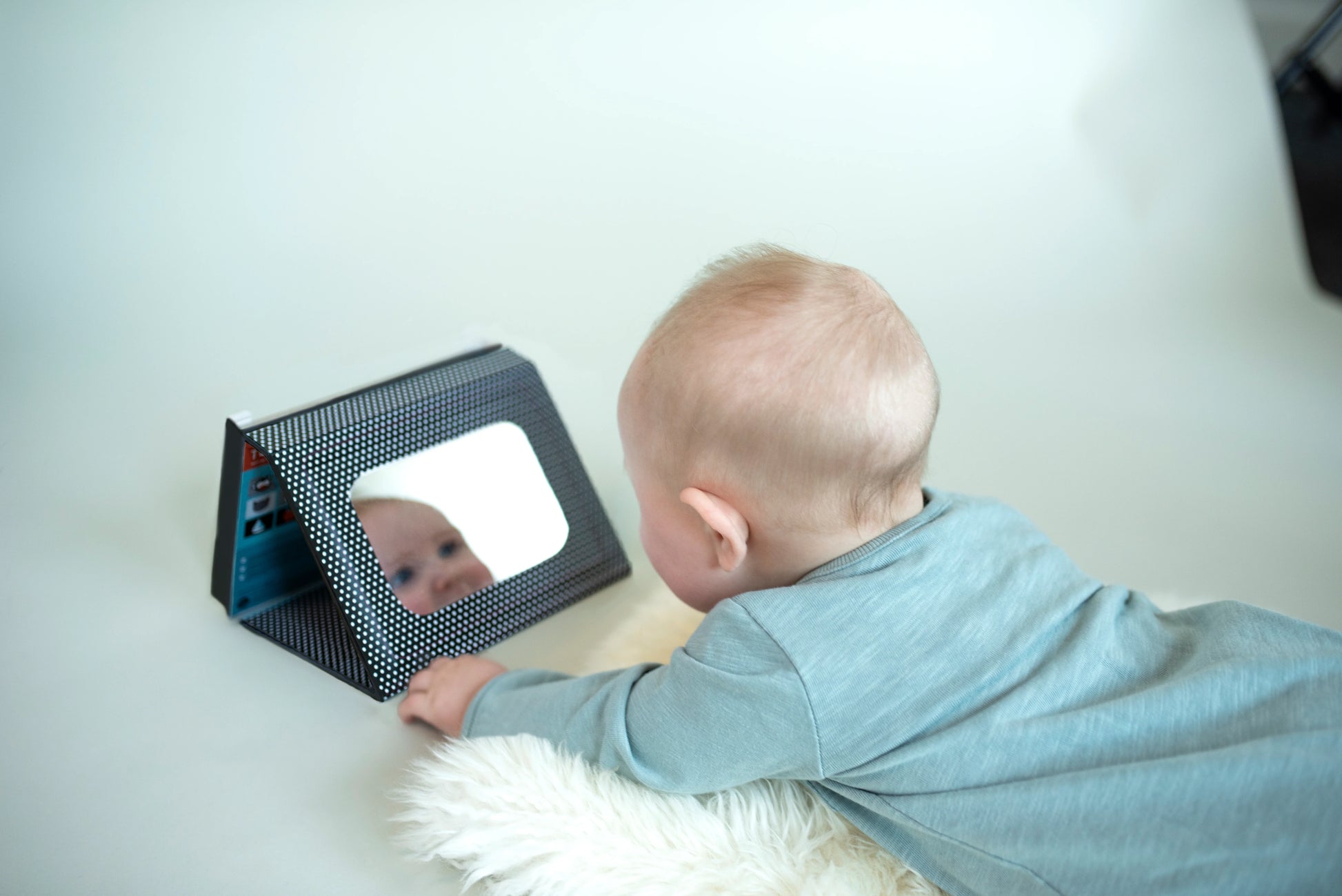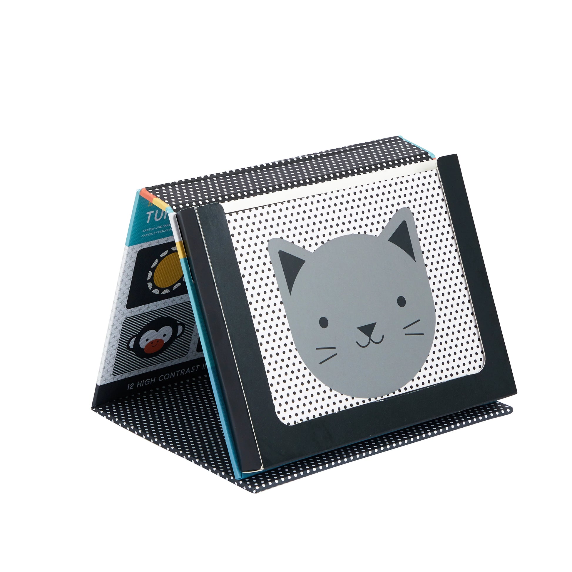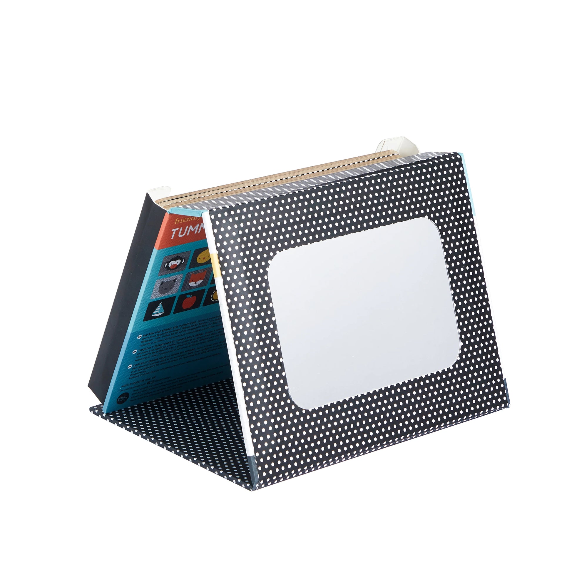 To set up for tummy time, flip open the simple stand-up easel box to display the art cards, or turn it around to the mirrored side for more fun and exploration. The collapsible stand includes 6 double sided high contrast art cards and a baby safe mirror.