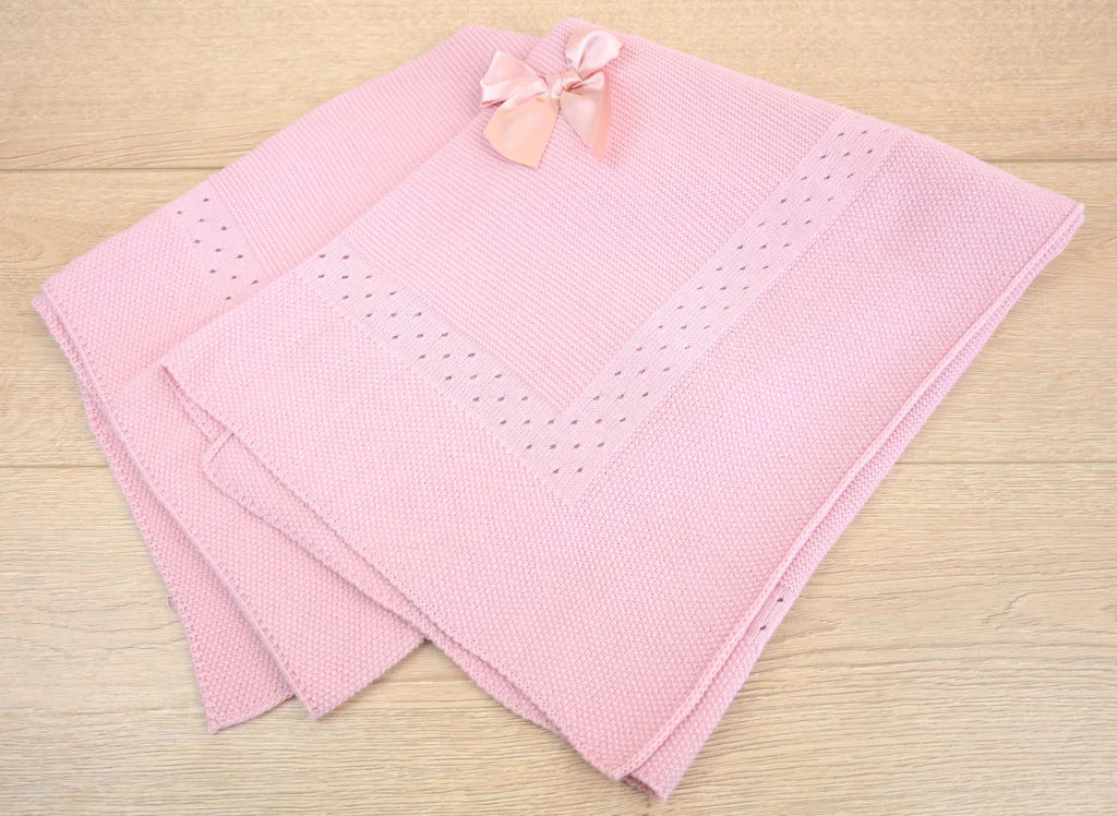 Traditional baby shawl in smart dusky pink super soft acrylic. This delightful square shawl has a classic design and a smart border with satin ribbon bow. It measures 100cm x 100cm. A great new-born gift.